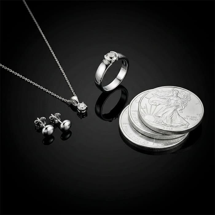Это разновидность сплава, состоящая на 92,5% из чистого серебра и на 7,5% из других металлов, обычно меди, такое сочетание создает более прочный материал по сравнению с чистым серебром, которое мягкое и подвержено повреждениям.
